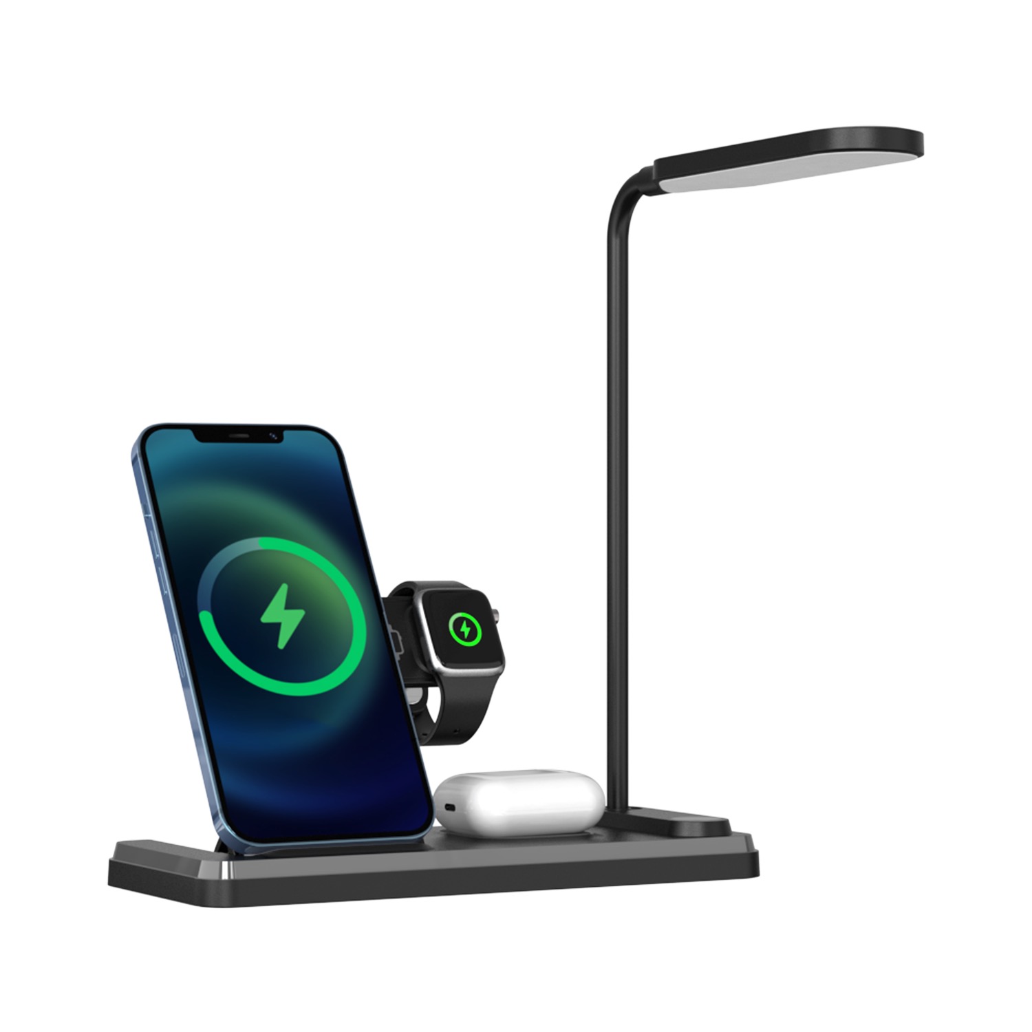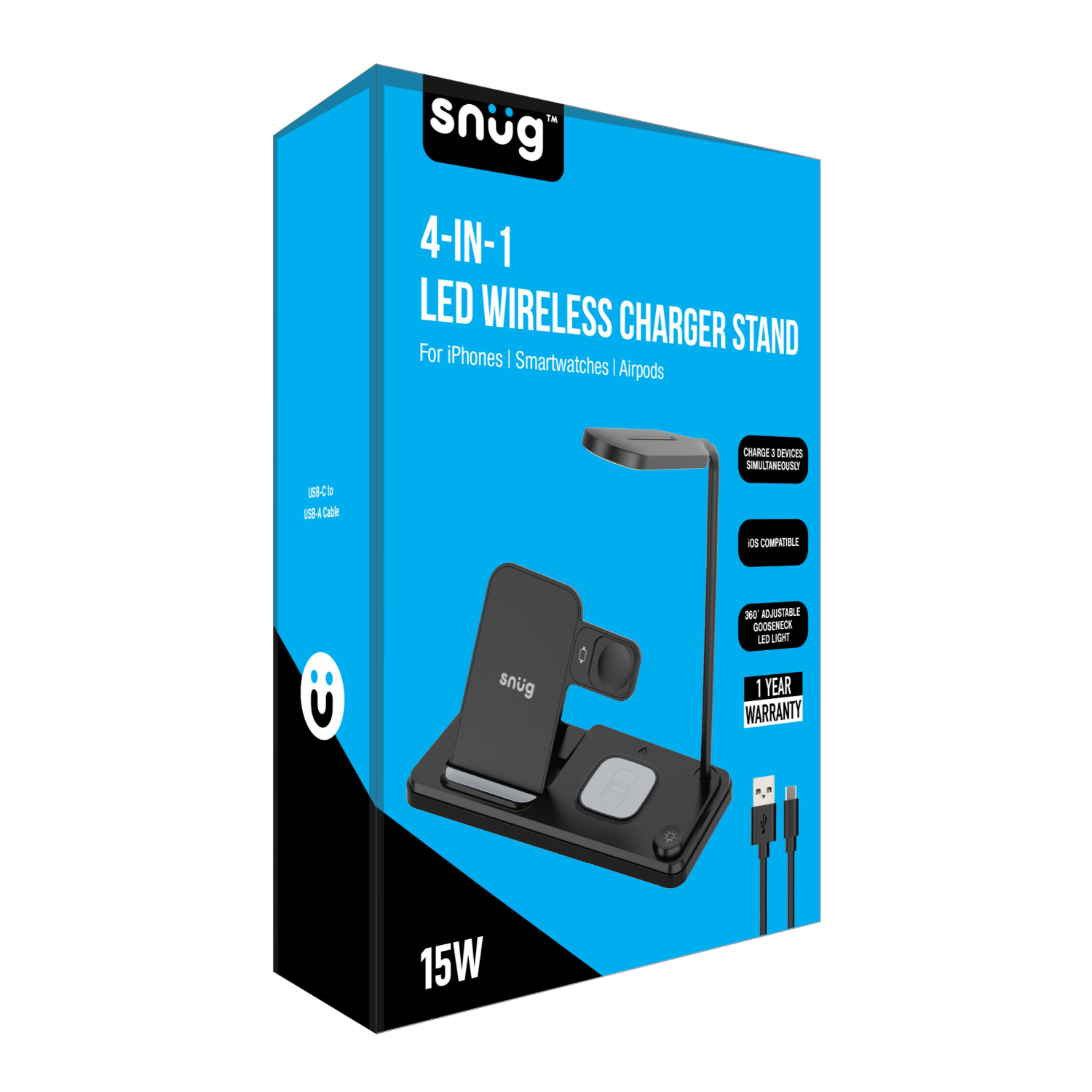 Illuminate and power up your devices with the Snug 4-in-1 Wireless Charger with Dimmable LED Lamp! This multifunctional charging station combines fast wireless charging with an adjustable LED lamp, creating the perfect bedside or workspace solution. Charge your iPhone, Apple Watch or AirPods – while enjoying customizable lighting to match your mood. Say goodbye to clutter and hello to smart, efficient charging with a touch of ambiance!