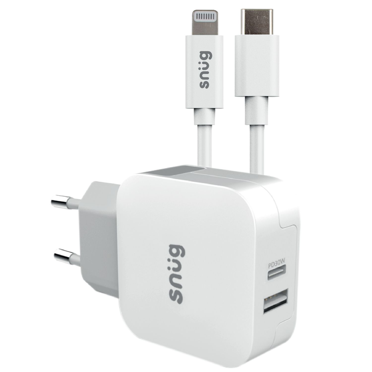 Enjoy faster charging with the Snug Power Delivery Home Charger that can charge 2 devices simultaneously. It has a total output of 30W. Type-C To MFI Lightning Cable Included.