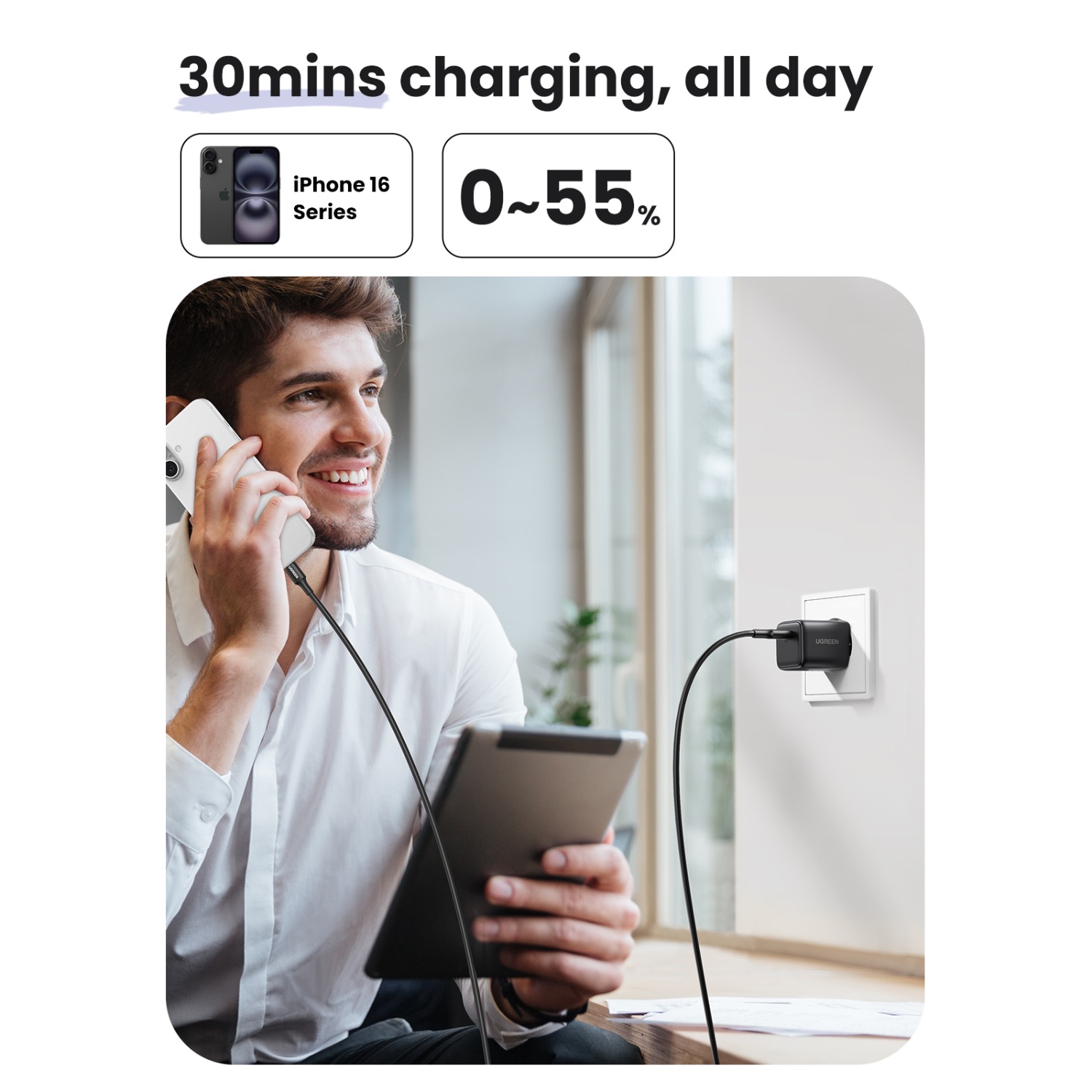 Stay fast, efficient, and fully charged with the UGREEN 1 Port 30W PD Wall charger, your ultimate charging companion for home, work, or travel. Featuring advanced fast-charging technology and a compact, fire-resistant design.